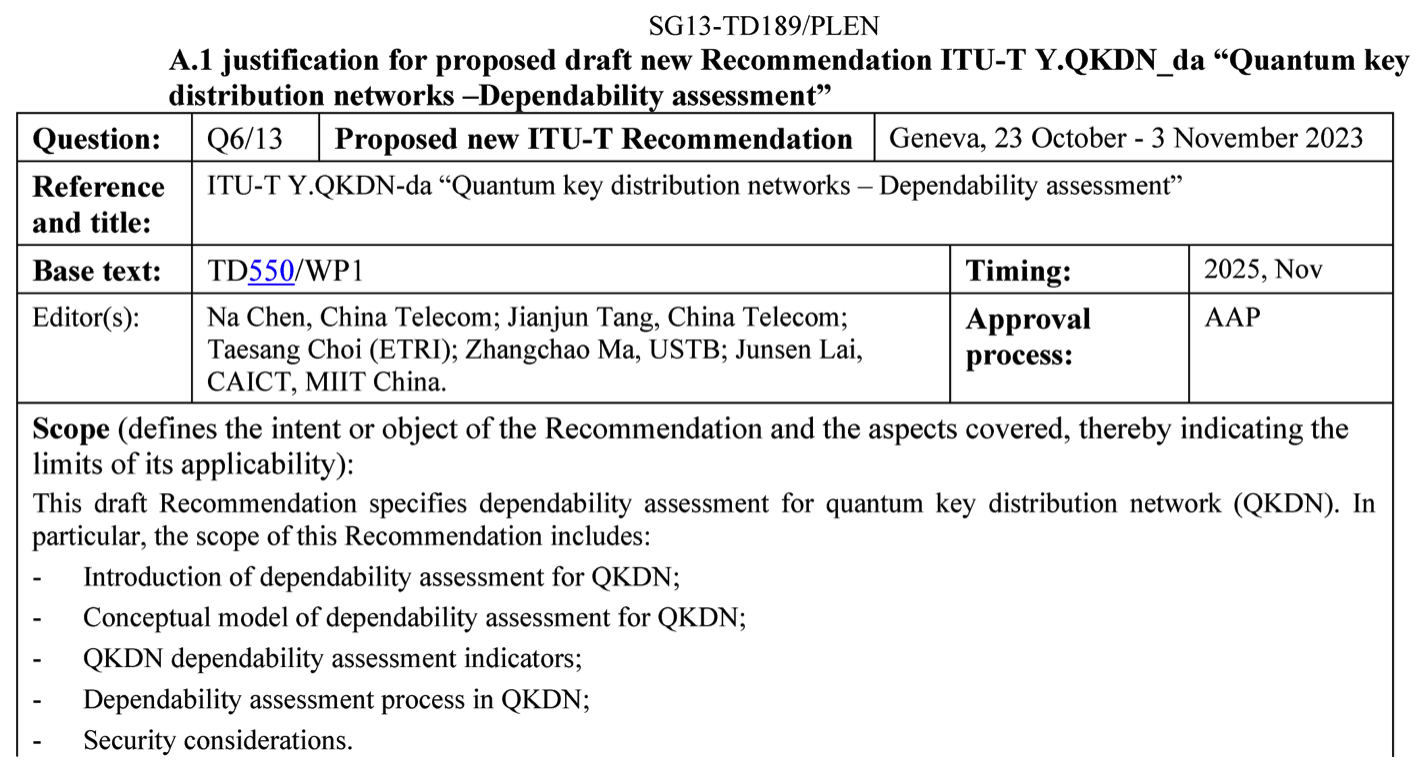 10月23日至11月3日,國際電信聯(lián)盟電信標(biāo)準(zhǔn)部門第13研究組(ITU-T SG13)全體會議在瑞士日內(nèi)瓦召開。會上,由中國電信研究院牽頭的國際標(biāo)準(zhǔn)立項(xiàng)提案:ITU-T Y.QKDN-da: “Quantum key distribution networks – Dependability assessment” (量子密鑰分發(fā)網(wǎng)絡(luò)——可靠性評估)獲批立項(xiàng)。這是央企在推動量子通信網(wǎng)絡(luò)國際標(biāo)準(zhǔn)化過程中的首個重要成果。