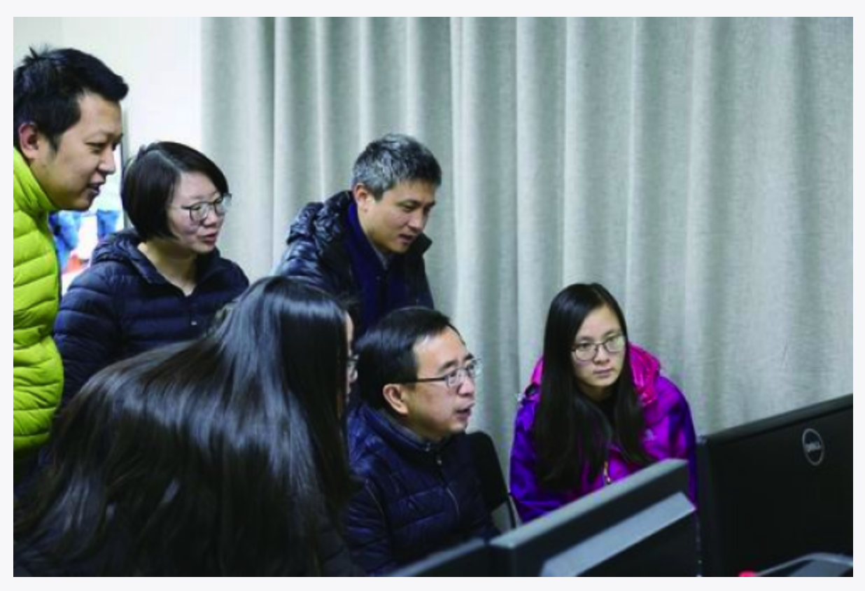 潘建偉(前排中)實(shí)驗(yàn)團(tuán)隊(duì)在討論數(shù)據(jù)。