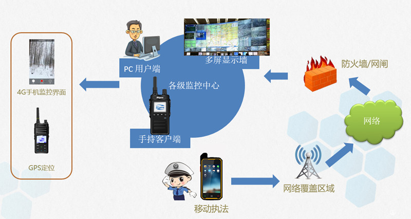 用戶通過集群調度管理平臺進行用戶管理、群組管理、設備管理對終端對講機進行設置后,根據對講協議和數據及時完成視頻交換,將多個對講終端互聯互通,實現單戶、組呼、搶話語權、視頻對講等一系列的遠傳功能,同時通過平臺結合業務需求對對講終端進行查詢、跟蹤、分析等功能。